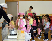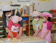年長組のお料理教室には、今回とても大きな任務がありました。それは『お別れ会食会でいただく幼稚園全員分のカレーを作ること。』先生から説明される手順を良く聞き、材料を切っていきました。具が煮えて、いよいよカレールーを一人ずつ入れる段階で、年少・年中組さんが見学にきました。「いいにおい」の声に、お別れ会食会を待ち遠しく思う気持ちがこもっているようでした。みんなの力が集まったカレーがぐつぐつとおいしそうにできあがりました。