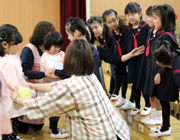 年長組は、「心配なんていらない」「Believe(ビリーブ)」の2曲を発表しました。たくさん遊んだおともだちとの日々や先生との数々の思い出、これから小学校へ入学する期待と不安を胸に元気よく合唱しました。最後に、年中・年少さんから年長組のおねえさん一人ひとりにプレゼントが贈られました。