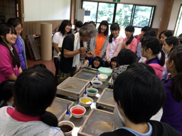 画用紙大のワクを使って紙をすき、思い思いの色付けを行いました。
