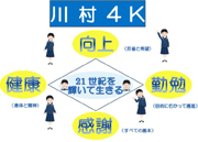 川村学園の12個の月間目標の中で、頭文字が「K」で始まる4つの言葉は21世紀を輝いて生きるためにとても大切なものです。「川村4K」を心がけて、授業やクラブ活動に力いっぱい取り組みましょう。 |