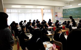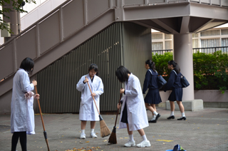中高生が手分けして中庭などを清掃している毎朝のさわやかな風景です。この奉仕当番活動をとおして、誰かのために自分が役に立つことを喜びに感じる心が育まれています。 |