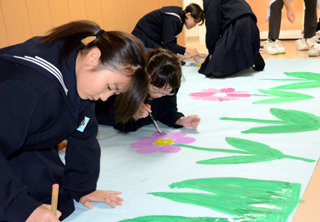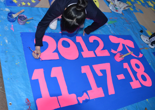 学園祭を目前に控え、学年展・模擬店・縁日などに向けた壁画が作成されています。 |