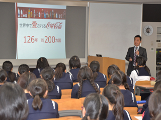 今回のクエストエデュケーションプログラムでは、日本コカ・コーラ株式会社の方がお見えになり、各クラス班ごとに様々なアドバイスをいただきました。その後、自動販売機で社会貢献できることを中心に講演をいただきました。 |