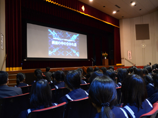 今月は、目白警察署生活安全課の方から「スマートフォンの落とし穴」についてのビデオとお話をいただきました。表彰は、「第49回写生コンクール」(中学校)、「読書感想文コンクール」(中学校)、「マラソン大会」(中学1年~高校2年までが実施)、「第60回記念豊島区民駅伝大会」(陸上競技部)が行われました。 |