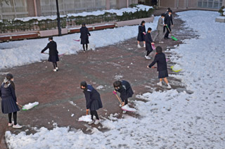 前日14日(月)の降雪で通学路や中庭にもたくさんの雪が積もりました。今朝は、早く登校した生徒が率先して雪かき作業に取り組んでくれました。 |