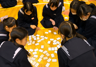 伝統行事の「百人一首大会」を散らし(散らし取り)で競いました。今年度は、「競技かるた同好会」の生徒が読み手となりました。 |