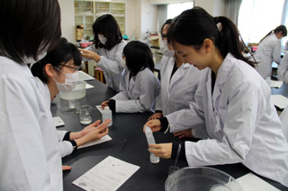 溶液を混ぜて常日頃使っている繊維(ナイロン)ができることに驚きました。生徒たちはできるだけ長い繊維が作れるように慎重に作業を進めました。 |