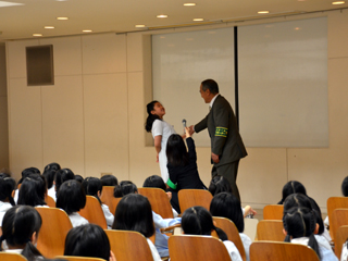 不審者から身を守るためのDVD「いかのおすし ものがたり」を鑑賞したあと、目白警察署の方から、自分の身を守る方法を各学年のモデルになる児童に体験してもらいながら教えていただきました。
