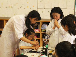 今年からクラブ活動に参加した4年生は先生の指導のもと、一画一画に神経を集中させて筆を運びました。 |