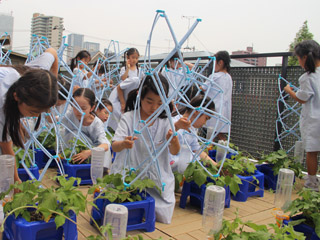 4月に蒔いたアサガオの葉の数が増え、つるも伸びて大きくなりました。伸びたつるをちぎれないように優しく支柱に巻きつけました。 |