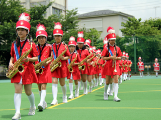 鶴友会ブラスバンド・バトン隊がグラウンドで発表会を行いました。 |