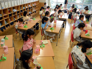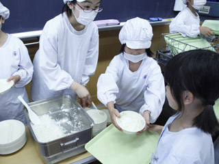 お当番さんはエプロン、帽子、マスクをつけたあと手を洗い、6年生のお姉さんと一緒に配膳をしました。