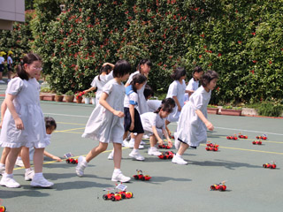 準備をしてきた縁日あそびを幼稚園の年長組に披露しました。優しく遊び方を教えてあげながら、楽しい時間を過ごしました。 |