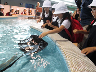 ペンギンやドーナツ型の大きな水槽で群れをなして泳ぐマグロを観察したり、エイに触れたり、600種を超える世界中の海の生き物に児童たちは興味津々でした。 |