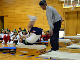 台上前転は、回転運動であることを確認し、跳び箱から落ちないように、助走、踏み切り、前転、着地までの一連の動作を練習しました。 |