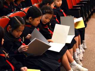 担任からのメッセージ付きのスケッチブックが今月も誕生者に贈られ、全校児童でお祝いしました。