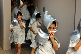 地震発生後に会食室から出火したとの想定で、避難訓練を実施しました。児童たちは机の脚ををしっかり持って身の安全を確保し、先生の指示に従って速やかに行動できました。