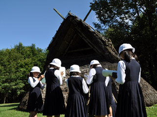 尖石縄文考古館では、土器や土偶、復元家屋を見学し、山荘では、周辺の植物環境の観察や火おこし体験をしました。悪天候のため、蓼科山登山はできませんでしたが、キャンプファイヤーでは、実行委員の音頭で始まり、どの子も6年間の蓼科での思い出にひたることができました。