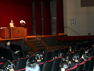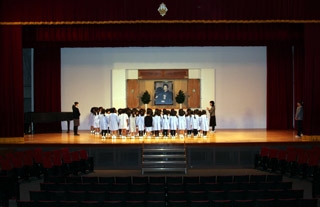 月間目標「整頓」についてと目前に控えている学園祭に向けて体調管理のお話、そして創立者記念日の説明がありました。その後、4年生と6年生の図画コンクール表彰を行いました。