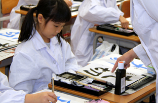 初めての毛筆による書き初め大会。半紙の中に、バランスよく漢字2文字「大切」を書いていきます。 |