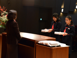 今月は、1年生(どうぶつとなかよし)と3年生(我が家のシーサー)の図画コンクール、学園祭プログラム表紙絵入賞者の表彰を行いました。 |