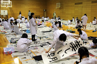 全クラスが体育館に集まり、書き初めの練習を行いました。 |