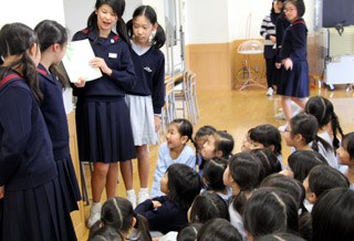 低学年にも書物を楽しんでもらるよう図書部の6年生が、お昼休みにフリールームで読み聞かせをしました。 |