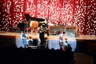 卒業生の野尻小矢佳さん方によるパーカッションコンサートが開かれました。マリンバによるぬくもりのある演奏やジャンベなどをはじめとする世界各国の楽器による独特のリズムを楽しみました。そして、体を楽器にしたボディーパーカッションでは、大講堂全体が一体感に包まれました。 |
