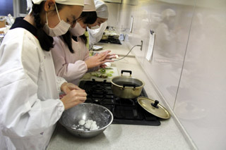 白玉を丸めて沸騰したお湯に入れるひと、フルーツを切るひとなど、班の中で分担して手際よくできました。
