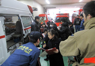 煙の中での避難の仕方を学び、くらしや命を災害から守る取り組みについて学習しました。 |