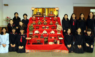 児童たちは手わけをしてお内裏様やお雛様、お道具類などを箱から丁寧に出し、位置を確認しながら緋毛氈の上に並べていきました。 |