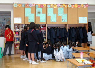万が一廊下に不審者がいたときに目立たないように、教室の中の児童は廊下から見えないところに集まり、黙って次の指示を待つことができました。 |