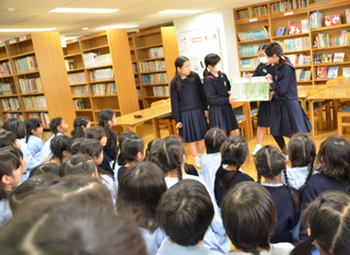 図書部の6年生が、お昼休みに図書室へ集まった約60人の低学年の児童へ絵本「まーくんとくま」の読み聞かせを行いました。 |