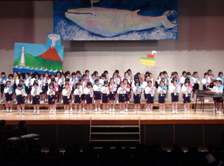 5年生による司会進行、1年生の開会のことばで「ひな祭り・6年生を送る会」が開かれました。この日のために各学年、一生懸命準備を重ね、卒業を控えた6年生へ心に響く歌声や合奏、音楽劇などが披露されました。6年生が退場する際には、プレゼントのしおり、カード、花束を一人ひとりに贈りました。