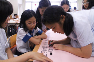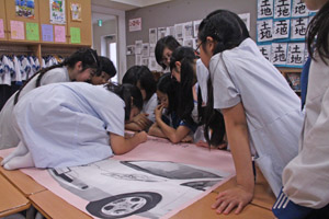 代表児童が台紙になる模造紙に、一文字一文字心を込めてお礼の言葉を書いていきます。 |
