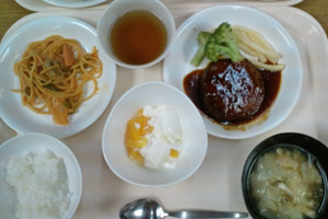 | 今日のメニューは煮込みハンバーグ、ナポリタン、味噌汁、ごはん、デザートは杏仁豆腐でした。 |