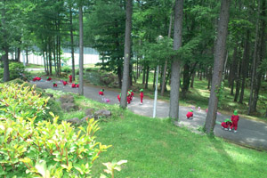 体操をして身体をほぐします。今日は女神湖周辺ハイキングがあります。 |