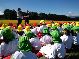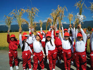 3年生秋の蓼科学習の様子です。2日目(9月25日)は稲刈りをし、山荘にもどってからいただいた稲で籾すり体験もしました。