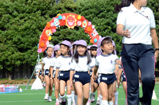 ご家族の方が見守る中、年少組、年中組、年長組の子どもたちが堂々とした様子で入場行進をしました。 |