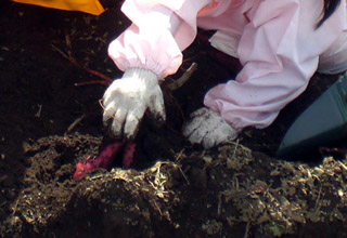 全園児と保護者が一緒にさつまいも掘りを行い、大きなさつまいもを持ち帰りました。 |