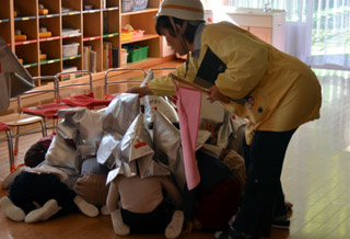 訓練後、副園長先生から「いつ地震が起きるのかわからないので、何かあったら大人の指示に従って動いてください。」と話がありました。 |