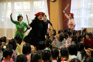 葉っぱが赤や黄色に色づく素敵な季節に生まれたお友だちをお祝いしました。お楽しみの時間は、学園祭で年長組が公演した音楽劇「ピーターパン」を先生方が演じました。 |