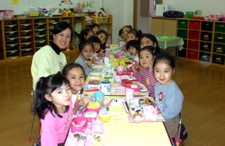 品物作りを終え、年少・年中・年長の縦割りグループ、お店やさんごとに集まってお弁当をいただきました。 |