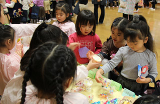 売り手と買い手に分かれ、6つのお店(ペット・電気屋・アクセサリー・八百屋・お菓子・お花)でお買い物を楽しみました。 |