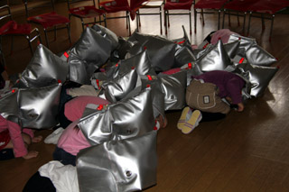 お話ししたり、泣いたりもせず、あわてず落ちついて防災頭巾をかぶりました。そして、保育室の中央に集まり指示がでるまで待機しました。 |