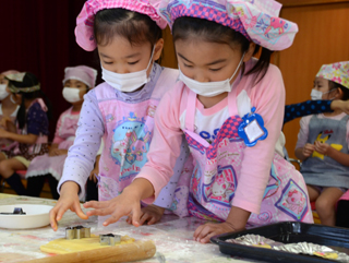 2回目のお料理教室では、クッキーを作りました。生地を自分の好きな型でくりぬき、チョコチップとカラーシュガーで飾りつけをしました。 |