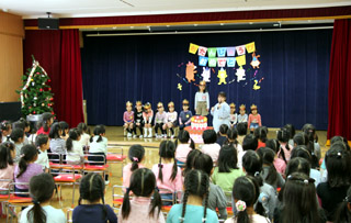みんなに「おめでとう」とお祝いされたお誕生月のお友だちは、「ありがとうございます」と笑顔で答えました。お楽しみの時間は、「かさじぞう」を鑑賞しました。 |