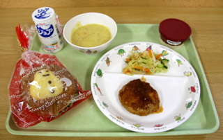 園児たちの大好きなカリカリサラダとハンバーグ。その他、雪だるまの柄のクリスマスパン、コーンポタージュ、アイス、飲むヨーグルトです。 |