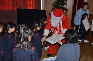 ゆうぎ室に突然サンタさんが忙しい中プレゼントを持って、来園してくれました。みんなは大喜びでそのお礼に大きな声で歌を披露しました。 |
