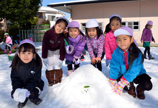 昨日、降り積もった雪が園庭を覆い、子どもたちは、元気いっぱい雪あそびをしました。 |